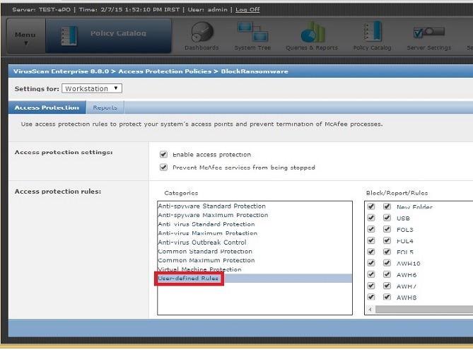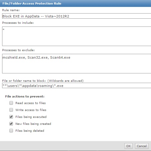 همچنین بخش Access Protection در نرم افزار McAfee VirusScan Enterprise دارای قسمتی با عنوان User-defined Rules است که کاربر را قادر می سازد اجرا شدن فایلهایی خاص در مسیرهای مورد نظر را رهگیری و مسدود کند.