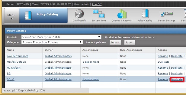 4- پالیسی سازمان را یافته و در ستون Actions بر روی پیوند Duplicate کلیک کنید. در صورتی که اطمینان ندارید که پالیسی صحیحی را Duplicate کرده باشید می توانید از پیوندهای ستون Assignments کمک بگیرید. بعنوان یک قاعده کلی اگر با کلیک بر روی پیوند مذکور عبارت My Organization ظاهر شود بمعنای آن است پالیسی انتخاب شده در صدر پالیسی های دیگر به گروه ها اعمال می شود.