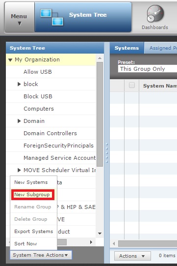 16- در ستون سمت چپ، در حالی که گزینه My Organization انتخاب شده است بر روی دگمه System Tree Actions کلیک کرده و گزینه New Subgroup را انتخاب کنید.