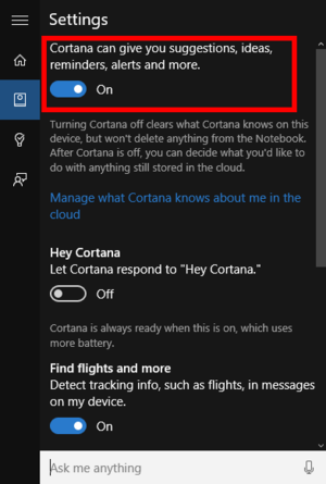 با کلیک بر روی نشان Cortana در نوار ابزار و انتخاب نشان Notebook و سپس گزینه Settings می توان با انتخاب حالت Off برای گزینه “Cortana can give you suggestions, ideas, reminders, alerts, and more” این بخش را غیرفعال کرد.