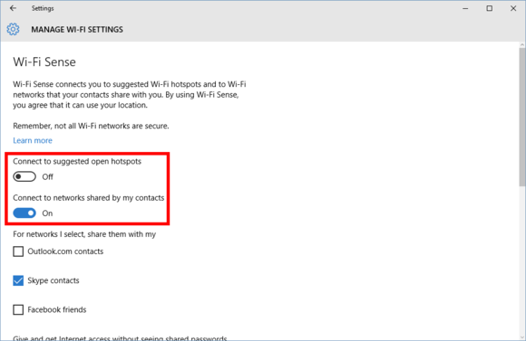 یکی از امکانات جدید و خلاقانه در Windows 10، قابلیت Wi-Fi Sense است که به صورت پیش فرض نیز فعال است. Wi-Fi Sense به کاربر اجازه می دهد تا دسترسی به رهیاب های Wi-Fi به اشتراک گذاشته شود. گذرواژه رهیاب در پس زمینه و به صورت رمز شده به اشتراک گذاشته می شوند. افرادی را که کاربر با آنها دسترسی به شبکه را به اشتراک می گذارد، گذرواژه اصلی را نمی بینند و توانایی به اشتراک گذاری آن را با دوستان خود نیز ندارند.