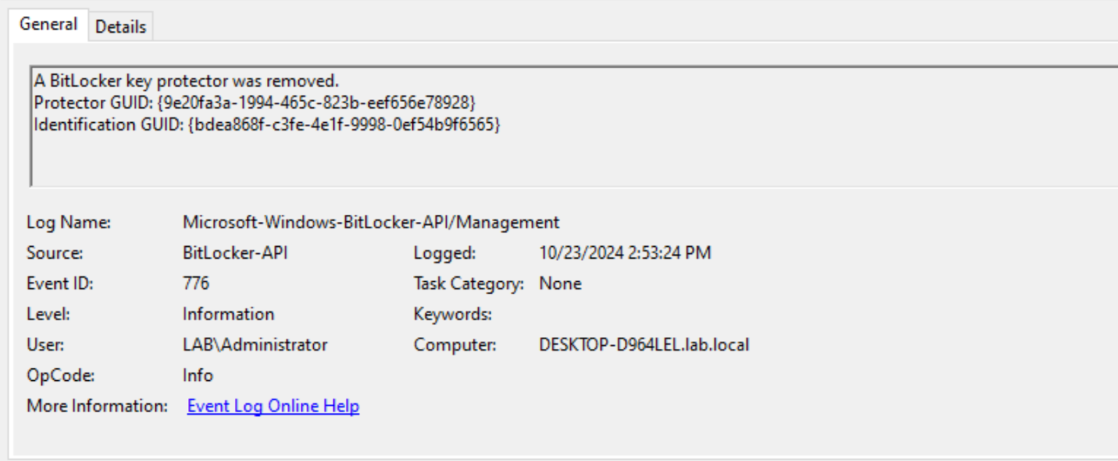 پایش رویدادهای منبع Microsoft-Windows-BitLocker-API/Management، به ویژه با شناسه 776 (رخداد ‌protectors removal) و شناسه 773(رخداد BitLocker suspension).