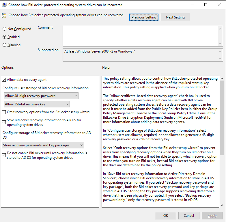 فعال‌کردن سیاست Do not enable BitLocker until recovery information is stored to AD DS for operating system drives؛ این سیاست اجازه نمی‌دهد BitLocker روی درایو سیستم فعال شود، مگر اینکه اطلاعات بازیابی در Active Directory ذخیره شده باشد. در نتیجه حتی اگر مهاجم Protectorها را حذف و گذرواژه جدید تعریف کند، قادر نخواهد بود فرآیند رمزگذاری را واقعاً شروع کند، مگر اینکه کنترل AD و اطلاعات بازیابی را هم در دست بگیرد. البته بیت‌دیفندر تأکید می‌کند این سیاست هم باید با دقت و طبق رویه‌های مدیریت تغییر (Change Management) اجرا و بررسی شود و مهاجم در صورت داشتن دسترسی ادمین دامنه می‌تواند قبل از حمله آن را غیرفعال کند؛ اما همچنان برای مهاجمان کم‌تجربه‌تر یک مانع جدی و برای مدافعان یک فرصت زمانی برای واکنش ایجاد می‌کند.