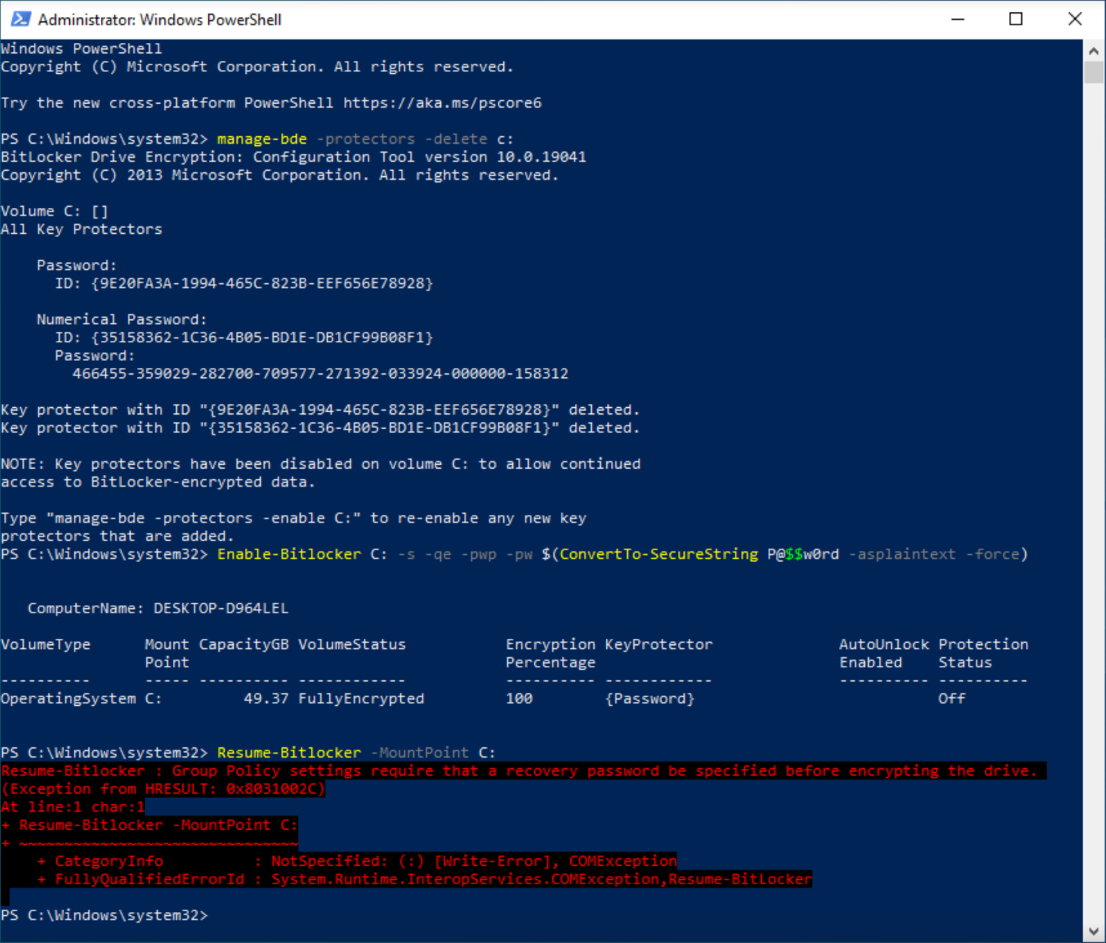 با دستور manage-bde -protectors -delete همه Protectorهای موجود، TPM، کلیدهای بازیابی، PIN و … را حذف می‌کند. گذرواژه تصادفی را به شکل SecureString به PowerShell می‌دهد و با Enable-BitLocker و Resume-BitLocker فرایند رمزگذاری را روی درایوهای هدف آغاز می‌کند. معمولاً حدود ۱۰ دقیقه طول می‌کشد، اما بسته به حجم و سخت‌افزار متغیر است.