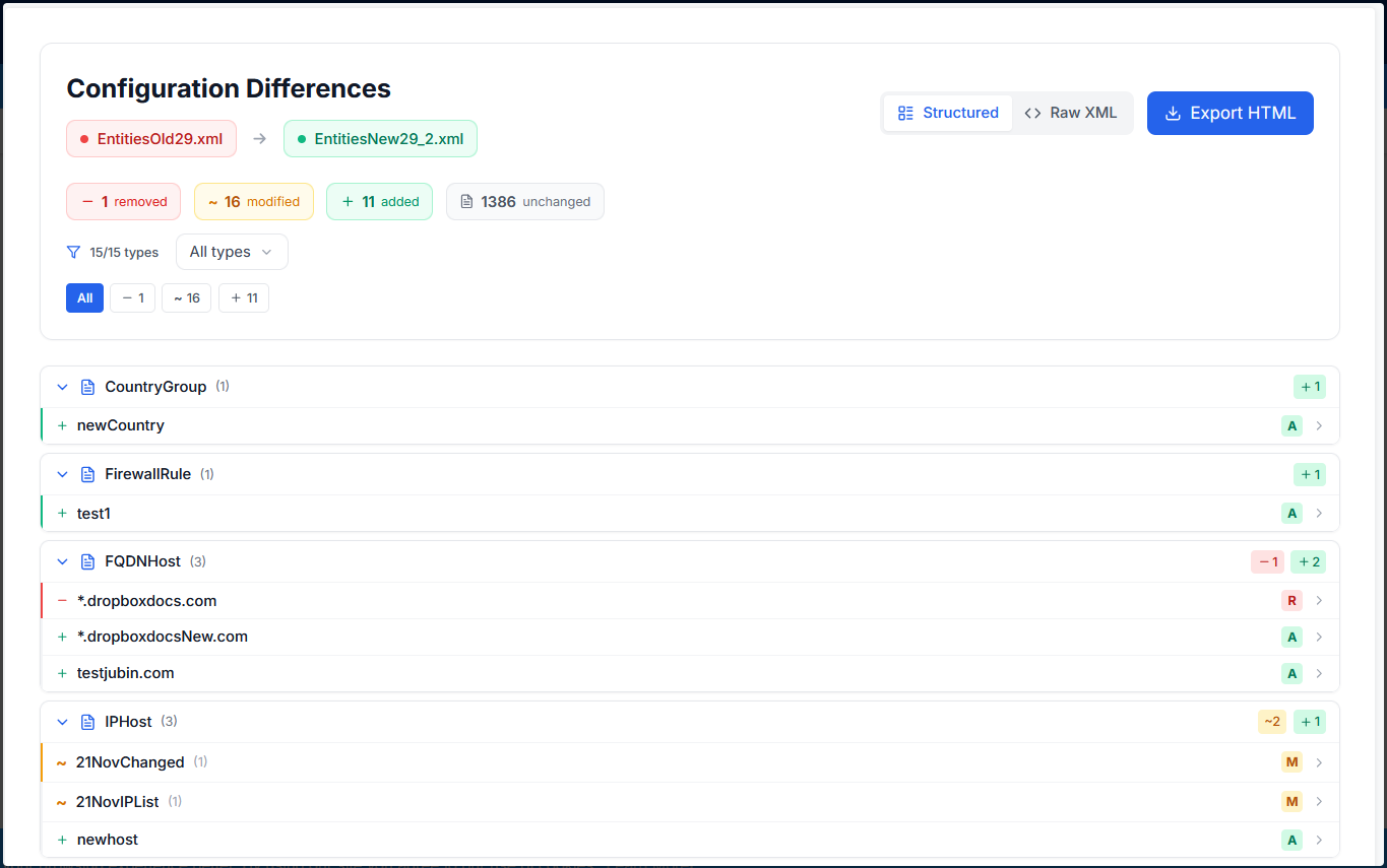 • خروجی و اشتراک‌گذاری HTML: امکان دانلود یا اشتراک‌گذاری گزارش‌های پیکربندی با فرمت قابل خواندن برای انسان را فراهم می‌کند و فرآیند بررسی، تأیید و مستندسازی را ساده‌تر می‌سازد.